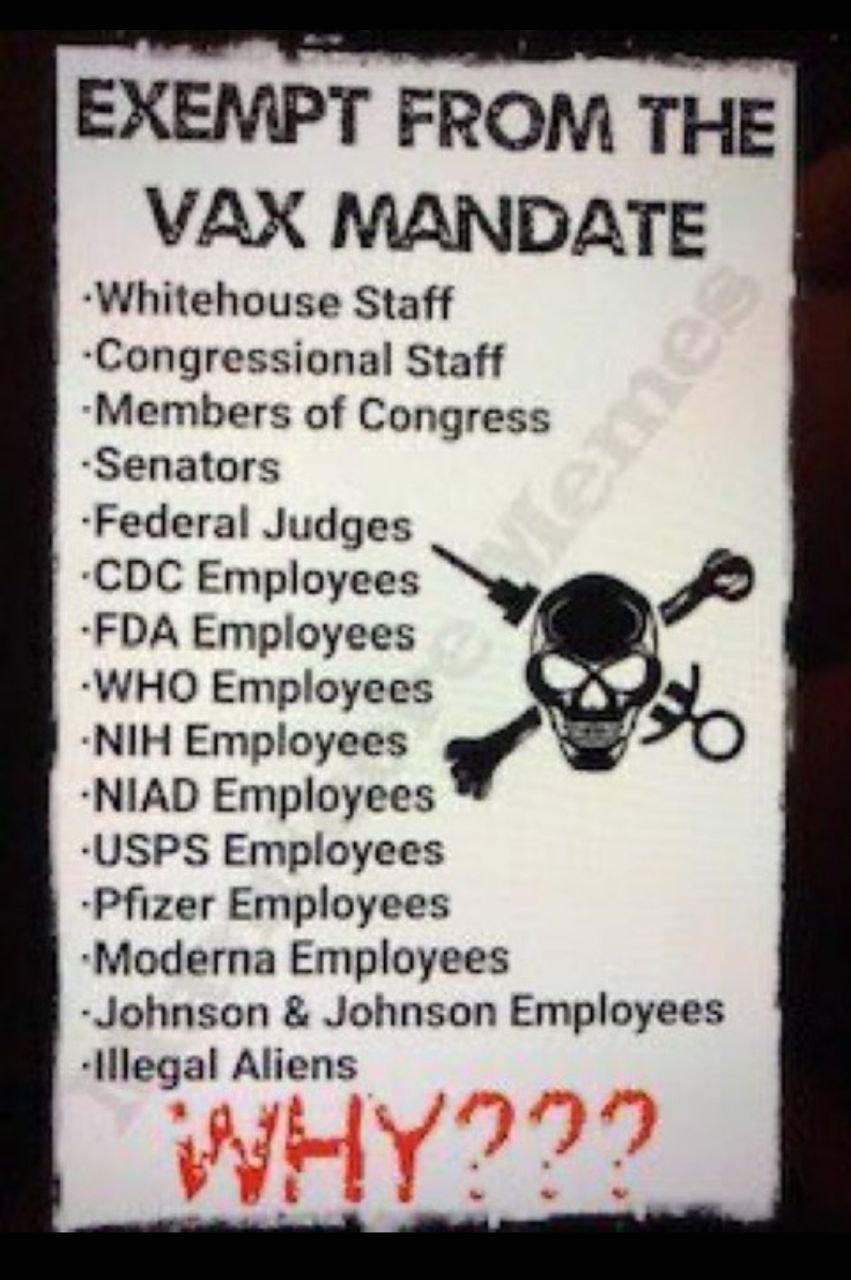 ‼️Liste der Arbeitgeber, die ihre Mitarbeiter während der Plandemie nicht zur Impfung verpflichtet haben‼️ Das Weiße Haus Kongress und Mitarbeiter Oberster Gerichtshof CDC FDA WHO Moderna Pfizer BioNTech USPS Wahlservice Covid-Testlabore Alle illegalen Einwanderer