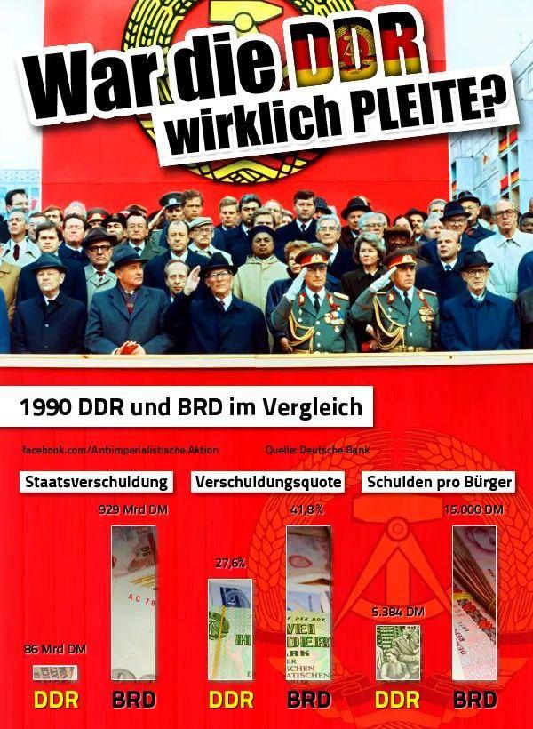 De facto war die sozialistische deutsche Wirtschaft solider, als die Kapitalistische und konnte einen konstanten Wachstum verzeichnen im Gegensatz zur Krisen geschüttelten Wirtschaft der BRD.Kernpunkt der Verleumdung der DDR-Wirtschaft ist eine angeblich extreme Verschuldung gegenüber kapitalistischen Staaten. Eine realistische Aussage über den wirklichen Stand der Verschuldung wurde nach langjähriger Arbeit durch die Deutsche Bundesbank gegeben. (Siehe Infografik) Die DDR hatte 1990 bis zur Auflösung Kunst- und Kulturschätze, Maschinen, Fabriken, Bodenschätze, Immobilien, Seen, Wälder und Land im Wert mehrerer Billionen Dollar, sowie nebenbei auch einige Goldreserven etwa 60 Tonnen. Und sie hat bis zuletzt alle Löhne und Renten zahlen, alle Kredite und Zinsen bedienen konnte und war nie zahlungsunfähig, nie überschuldet und nie kreditunwürdig, wie oftmals behauptet wird. Die Lüge, dass die DDR angeblich Pleite war geht vor allem auf das sogenannte Schürer-Papier von 1989 zurück. In welchem Gerhard Schürer unter anderem behauptete, dass die Auslandsschulden der DDR 49 Milliarden DM betrugen. Gerhard Schürer korrigierte 1990 selbst seine Analyse vom Oktober 1989: "Die Auslandsverschuldung der DDR war mit 20,3 Milliarden DM um mehr als die Hälfte niedriger, als wir im Oktober 1989 ausgewiesen haben." Tatsächlich betrugen die Auslandsschulden der DDR nach der Bilanz der Deutschen Bundesbank aus dem Jahr 1999 - lediglich 19,9 Milliarden Valutamark. De facto war die sozialistische deutsche Wirtschaft solider, als die Kapitalistische und konnte einen konstanten Wachstum verzeichnen im Gegensatz zur Krisen geschüttelten Wirtschaft der BRD.0 Commenti ·0 condivisioni ·3 Views ·0 Anteprima -