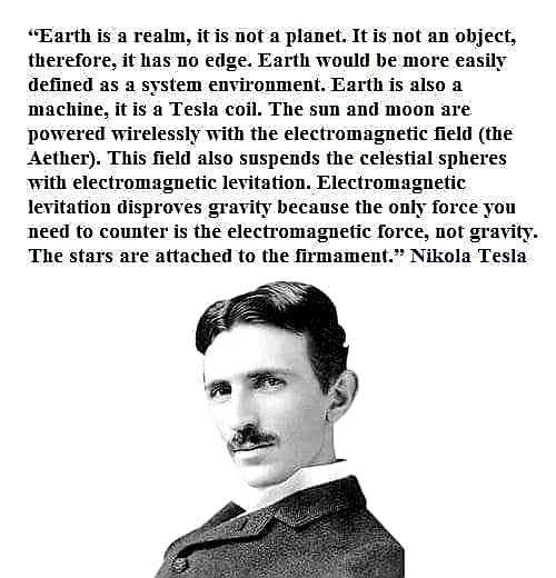 DIE ERDE IST EIN REICH, SIE IST KEIN PLANET - NIKOLA TESLA ! "Die Erde ist ein Reich, sie ist kein Planet. Sie ist kein Objekt, daher hat sie keinen Rand. Die Erde würde man eher als Systemumgebung definieren. Die Erde ist auch eine Maschine, sie ist eine Teslaspule. Die Sonne und der Mond werden drahtlos mit dem elektromagnetischen Feld (dem Äther) versorgt. Dieses Feld schwebt auch die himmlischen Sphären mit elektromagnetischer Levitation. Die elektromagnetische Levitation widerlegt die Schwerkraft, denn die einzige Kraft, der man entgegenwirken muss, ist die elektromagnetische Kraft, nicht die Schwerkraft. Die Sterne sind mit dem Firmament verbunden."